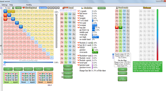 2. Fold на сибет по улицам у меня - 50/37/48. Полагаю мне нужно, чуть более агрессивно играть флоп - больше флоатить, чек /рейзить, рейзить. Дальше терн/ривер либо ловим слабости оппа, либо продолжаем не сдаваться при усилении руки. Подозреваю, что фолд по флопу у меня должен быть чуть поменьше, фолд по терну чуть побольше и фолд по риверу наверное около того и останется.
