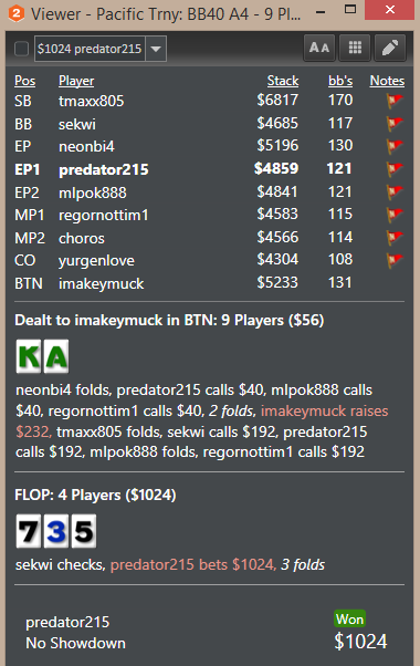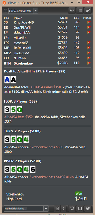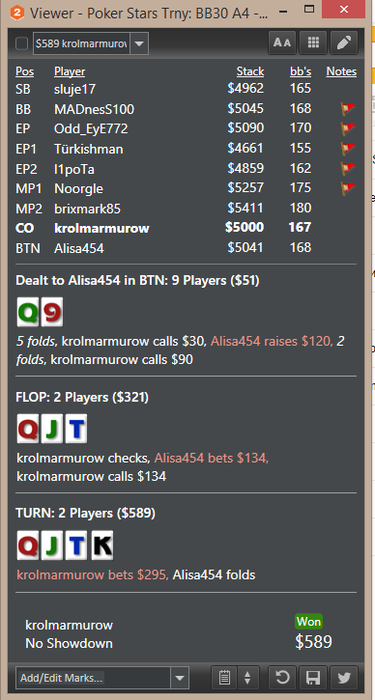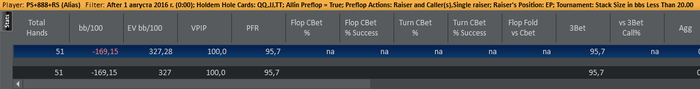 Базу разбирал на 500 К+ рук, таких ситуаций не много, но ...факт остается фактом. Минусово однако. С другой стороны как выкинуть такую руку, в этом стеке это натсовые руки, получается 3 бет пуш в утг не айс, играем 3 бет фолд ? ппц какая-то ересь ((( Еще раз посмотрю ХРК.