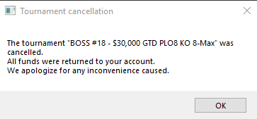 Сегодня на PokerKing был серийный турнир PLO8 за 630$. Специально лёг и встал позже и пропустил часть загрузки на старзах, чтобы ночью нормально отыграть его (начало в 02:30 по мск), задепал под него. Сел катать, спустя почти 3 часа после старта раздачи останавливаются, появляется табличка с текстом вроде "турнир остановлен администратором" и через минуту выскакивает окошко о том, что турнир отменен: