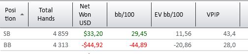 kopsev, как по мне восхищаться стоит, если она в +. А так, в принципе просто в пределах нормы, не более. И да, красная линия почти не зависит от игры на блайндах, это очень косвенный фактор. Красная это результат постфлопа больше, особенно в трибетпотах. Ну это мое сугубо личное мнение. С защитой бб у меня на самом деле беда, но я активно работаю над этой проблемой) Вот к примеру за этот месяц, нл5