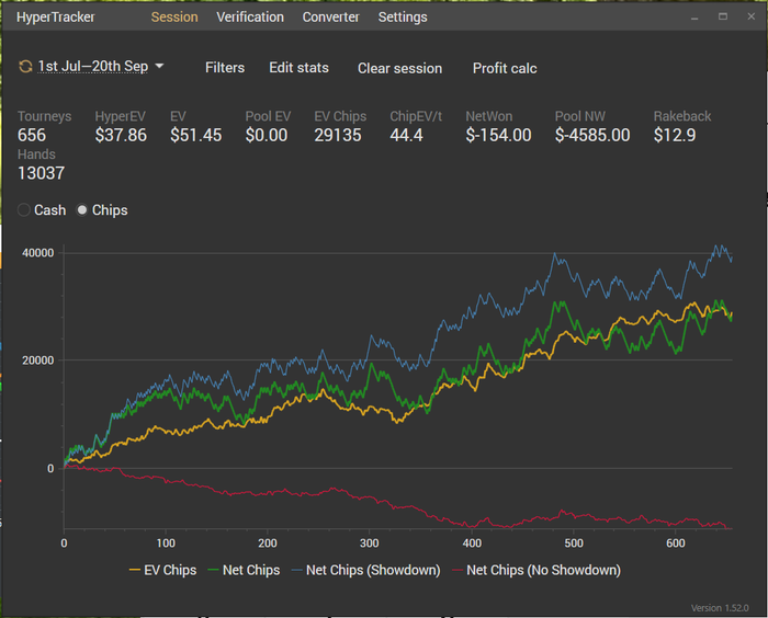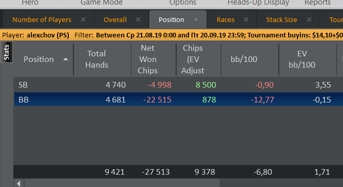 Отчет за пул 21.08-20.09. Очередной далеко не самый лучший период. Отыграл 2948 туриков и, что радует, 41 час теории. Сюда входит в основном видео тренировки, много в гто тренажере и меньше использовал симпл. Планы на следующий пул откатать 3к туриков на 15 и 40 часов теоретической работы. Дистанция небольшая, т.к. больше 3 столов не подключаю. Если резалты на 15 лучше не станут, уйду на 7 и буду там, пока чип ев не поднимется как минимум до 60 фишек на 4к турниров. Буду раз в неделю стараться делать отчет по проведенной работе. Всем GL))