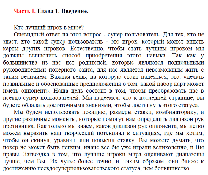 Так вот отсюда мораль, ищите кто слабее и рубитесь с ними. И чарт (а лучше сказать диапазон открытия, изолейта, сквиза, трибета, колд-колла, чего хотите короче) свой подстраивайте всегда под конкретных оппонентов, карт и доски, динамики за столом.....Как вам общая идея? По-моему я уже повторяюсь, надо завязывать с идеями Короче играйте и получайте удовольствие, тогда и тильт пройдет рядом, тихо и не заметно и все остальное будет ОК