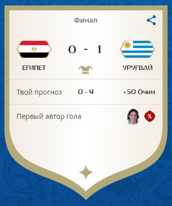 Идем дальше Ставим Уругвай 4-0 Египет, счет 1-0 =25 очков (без джокера) ЧТООО?!