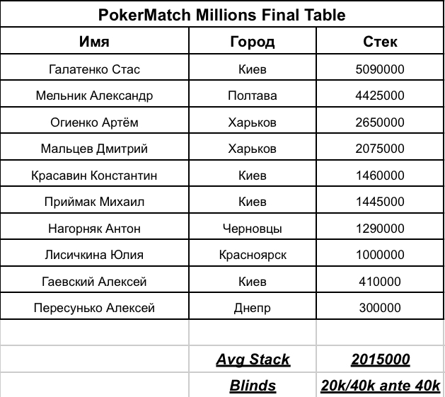 Чипкаунт финального стола турнира PokerMatch Millions! Продолжение борьбы в понедельник, 16 сентября в 15:00. Вас ждет ТВ-стол с показом карт на каналах PokerMatch (YouTube и Twitch), Full House Kyiv (YouTube) и нашей серии (Facebook)!