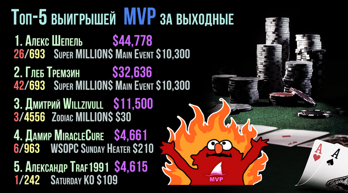 🔥 23 раза за прошедшие выходные игроки MVP выиграли в турнирах больше $1,000.