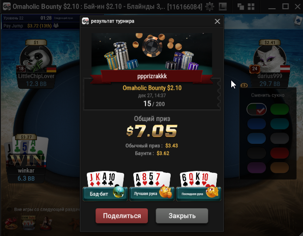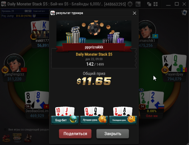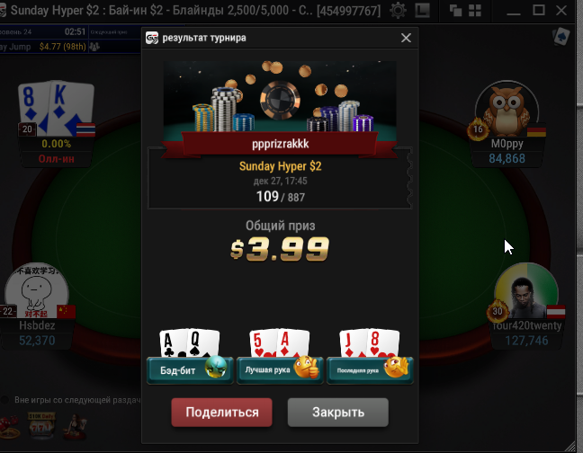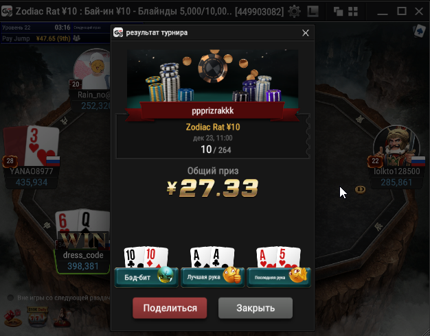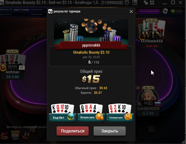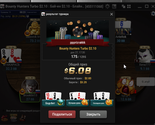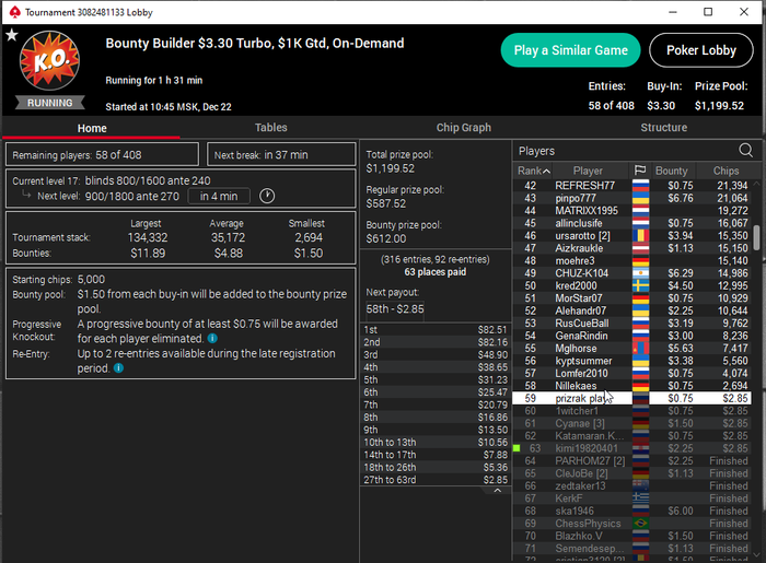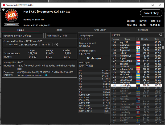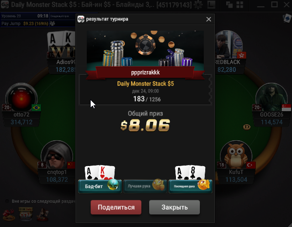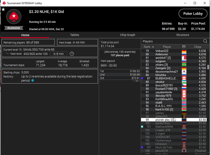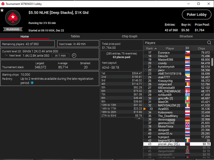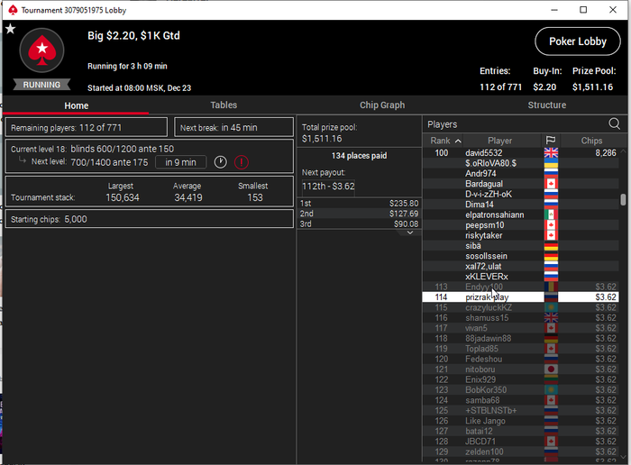 Всех приветствую! Поздравляю всех с наступившими праздниками. Хочу проинформировать всех игроков, кто следит за моим марафоном о том, что я не пропал, просто взял небольшую паузу. Пытался сыграть несколько сессий на низких лимитах, чтобы немного прийти в рабочую форму, но пока особых успехов там не случалось, также продолжаются бесконечные переезды. С целью избежания слива всех заработанных средств на эмоциях, я решил пока приостановить марафон до тех времен, когда я прийду в хорошую для игры форму. Когда это будет я не могу пока сказать, надеюсь что к середине месяца оправлюсь. Пока буду поигрывать небольшие турниры, если будут какие-то заносы, интересные проходы, видео, я вас оповещу об этом! А пока следите за моим каналом на ютубе