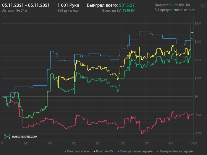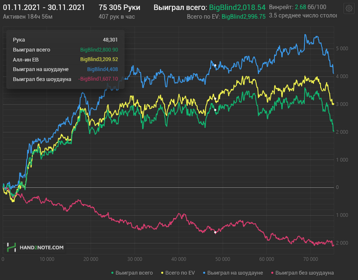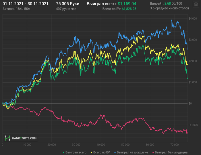 Главная ошибка, которую сделал в этом месяце была не за покерными столами, но она отразилась на все, что я делал за ними. Природа человека - это желание получить наслаждение. И любое страдание - это неудовлетворенное желание. И моя ошибка была допущена именно на этом глубинном уровне - я переходил на нл 100 с желанием иметь винрейт 6-7бб/100. Поначалу меня апнуло и все было хорошо. Потом начался нулевой период и общий винрейт опустился сначала до 6, потом до 4. Он долго держался на этом уровне, но все равно не соответствовал желаемому. И тут пошли уже неоптимальные решения, переколы ривера т.д. Риверов, конечно, наколлировал уйму. Хотел вскрыть и плюсануть. Зато воочию убедился как мало люди блефуют) Мой нормальный проигрыш без шоудауна - -5бб/100, то есть за 50к рук он должен был составить 25 стеков, а я минусанул только 9. Вот это и есть примерно та разница, как я понимаю, которая переколлирована.