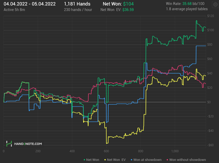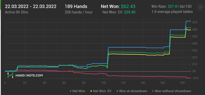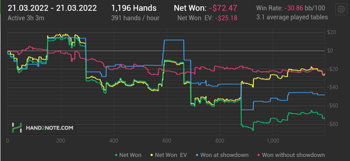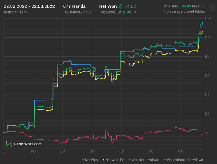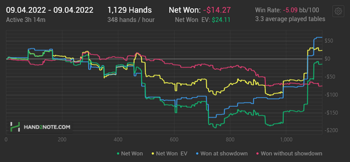 Сегодня складывалось так себе, проиграл фишам в основном и регу который с какого-то хрена 5бет пихнул 130бб против двоих в ранней, КК<АКо