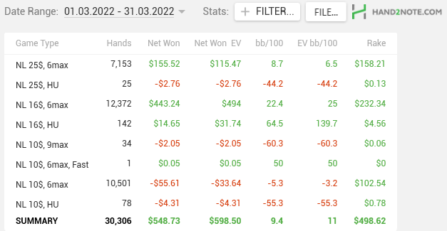 Месяц вышел хорошим, но на нл25 я так и не закрепился, пару раз заметил автопилот и еще пару раз лупанул по столу, немного подлил в МТТ. Усталось накопилась, хочу заставить себя не играть хотябы до вторника, ато обычно на 2й день уже открываю столы, буду пробовать следовать плану.