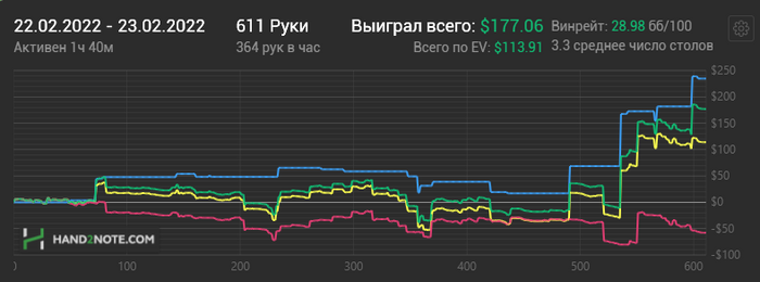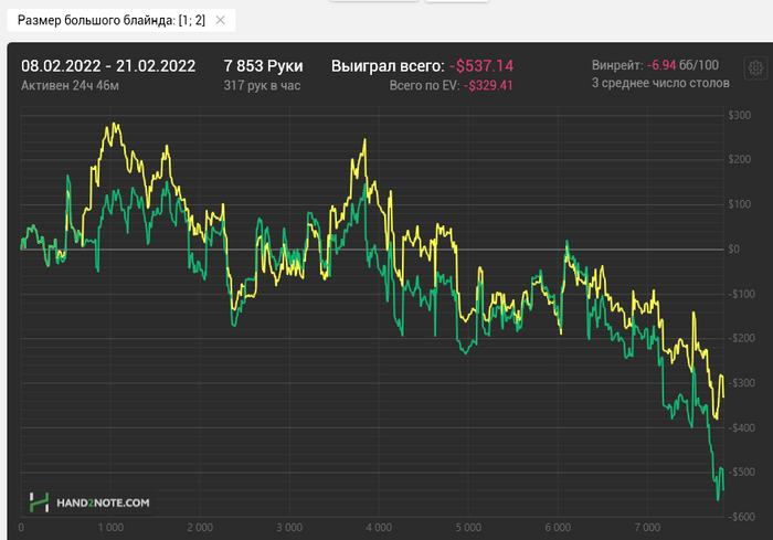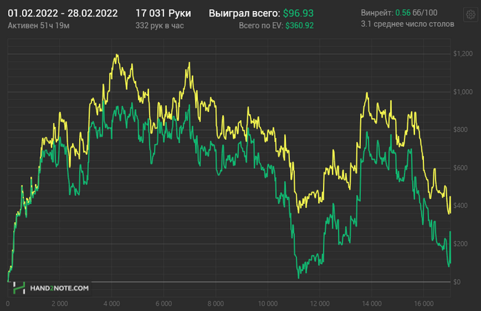 Вроде идёт получше, но усталость накапливается. Когда играешь с низким винрейтом, каждые ~5-10к рук жрёшь даунсвинги по 5-10 БИ, а т.к. я играю мало рук в час + мало часов в общем, в сумме это всё выливается в утомляющую тягомотину. Вроде отыграл месяц, устал, а по зелёной почти ничего не выиграл