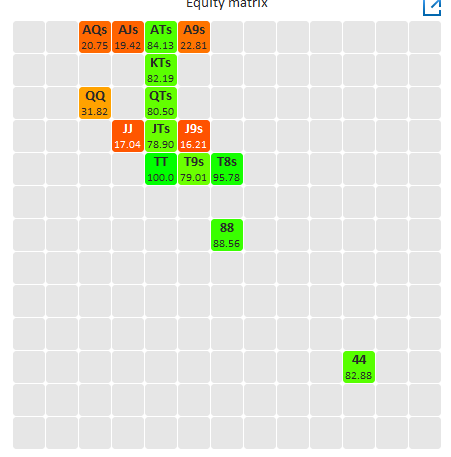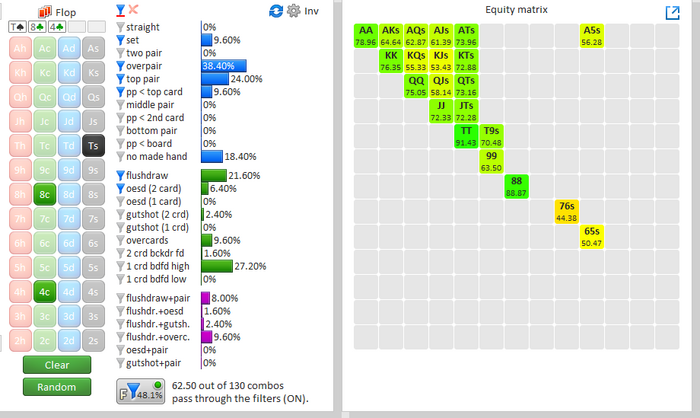 Можно понадеяться, что оппонент сыграет так с овер парой, но давайте посмотрим на эквити оверпары на тёрне, против диапозона продолжения оппонента