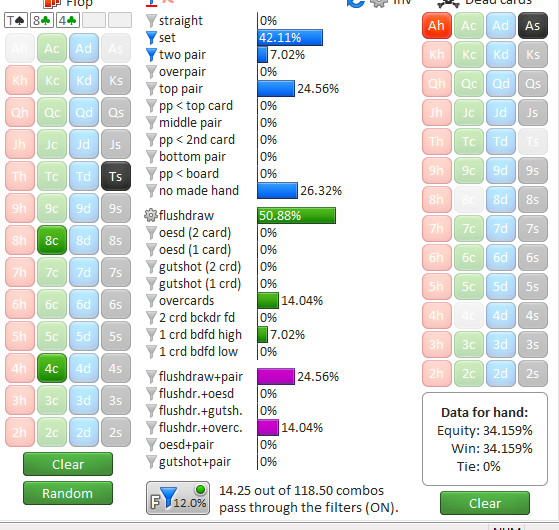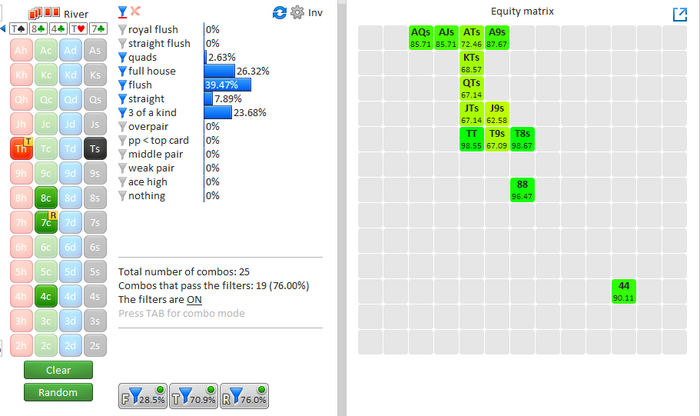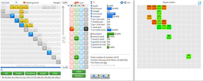 Тёрн существенно нас усиливает, у руки 87% эквити, ставим ещё 2/3 на велью. Наш диапазон в глазах оппа выглядит так