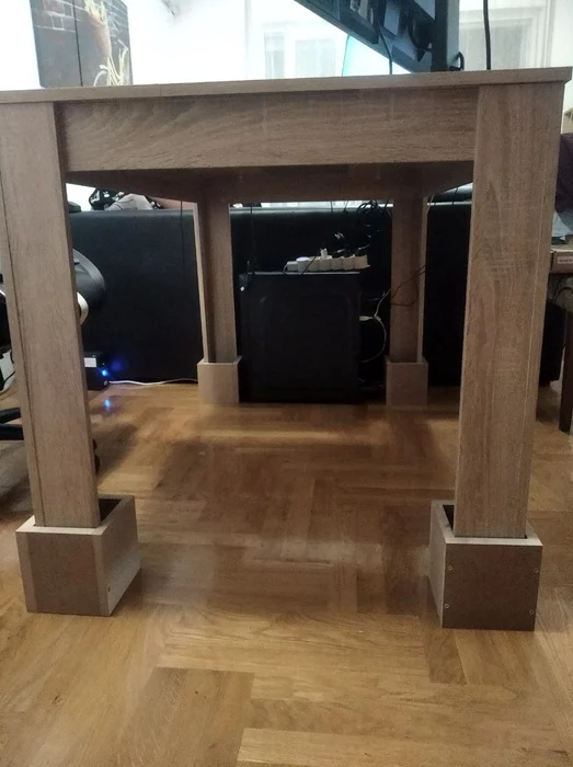 Стол в новой квартире отличный - длина 135 см., глубина 80, а вот высота стандартная - 75, для моего роста и кресла - низко, сидеть приходилось на обычном стуле, спина начинала ныть уже через час-полтора. Заказал подставки под ножки (внутри - вставки по 16-17 мм, чтобы регулировать высоту), сегодня привезли, теперь высота идеальная для меня - 81,5, такая же была у стола дома. Завтра на стриме начну тестировать 🍻