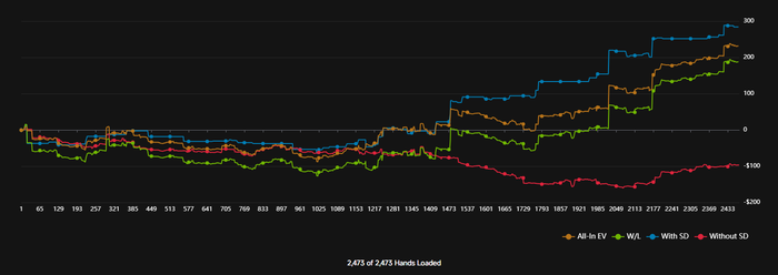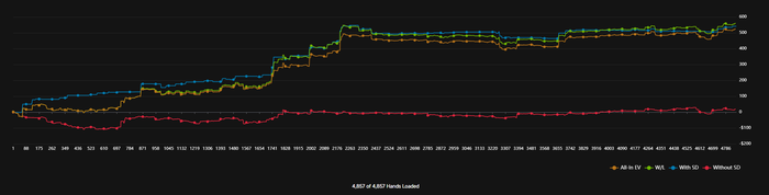 Откатал 2.5к раздач за 3,5 часа на нл50. Профит игрой: +105,62$ и +17,5 за ЛБ. В первые пару часов ран был тяжелый, но настрой отличный, нигде лишнего не залил. Есть внутреннее спокойствие — это опьяняющее чувство. Просто пытаюсь делать +ЕВ действия и эксплойтить лики поляны. Сейчас чуть глубже изучаю префлоп, внедрил лайтовые пуши, рейзы ривера, устраняю пробелы в игре. А также пытаюсь уйти в качество, а не количество, пока отрубил 25-ку, и потихоньку выхожу из кризиса в игре, о котором писал раннее.