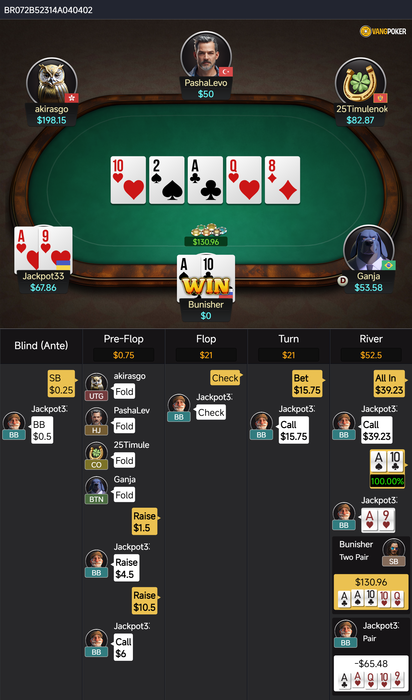 Bunisher @ 24.05.25Сейчас вспомнил почему чекал флоп — это джекпотная ситуация, сейчас на нл50 Ванга платят почти 500$, если предположить, что у оппа AQ, в колоде остается 1 аут на BBJ, это примерно 24бб, и даже без них кол должен пролезать.