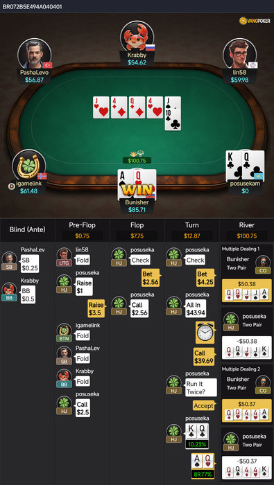 Раздача с нл25. 3бет пот против компетентного рега. На ривере хотел страшнее блефануть свою руку, решил чек-пушнуть — сработало.