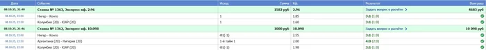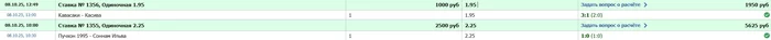 Результаты за вчера 08.10.25. 3 экспресса проиграло, 1 выиграл , банк увеличился на 6010 р, 2 экспресса в разгоне, итого за октябрь банк 79 327 р,-20,673%! 2 двойника проиграло, 1 выиграл, итого -63,28₽ , итого банк 94 996 р, сумма ставок на сегодня составит 4750₽.