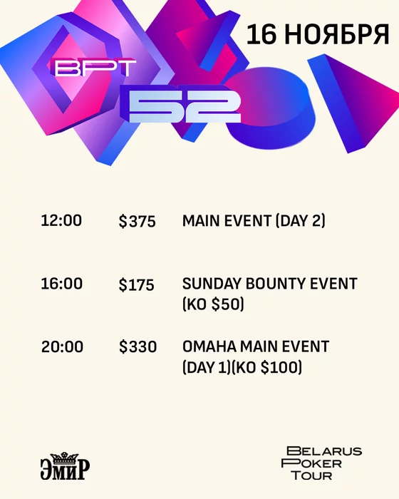 ✅ В 16:00 $175 Sunday bounty event KO — однодневный турнир с классическим нокаутом — $50. 9 уровней по 20 минут здесь доступна поздняя регистрация. Стартовый стек 25к — 125 бб.