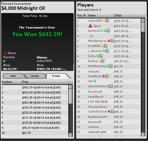 Следующей рукой сдали КК он фолд ;) Вообщем два раза попал в его слоупленый двумя чеками флеш с флопа, 1 раз с трипсом 2ек отдал по-минимуму правда, а второй раз с закрывшемся ривером стритом, причем он был тогда совсем короткий порядка 68к, я поставил овербет и был вынужден вколить пуш :( Была парочка ошибок с колом его потбетов (одна после проигрыша главного банка уже будучи шортом), не поверил в его потбет терна сухой доски после чека на флопе, хотя этого явно не стоило делать с А-хай. ХУ играл неплохо если не считать 1-3 ошибок, одна из которых указана выше, были два очень важных блефа - которые позволили мне выиграть больльшие банки. Ну будем надеяться в следующий раз все получится, в каком-нибудь более важном турнире :)