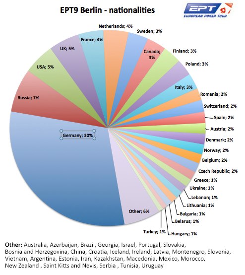 Количество участников Main Event EPT Берлин: Германия - 278 Россия - 66 США - 47 Великобритания - 46 Франция - 38 …Украина - 12 Белоруссия 9.