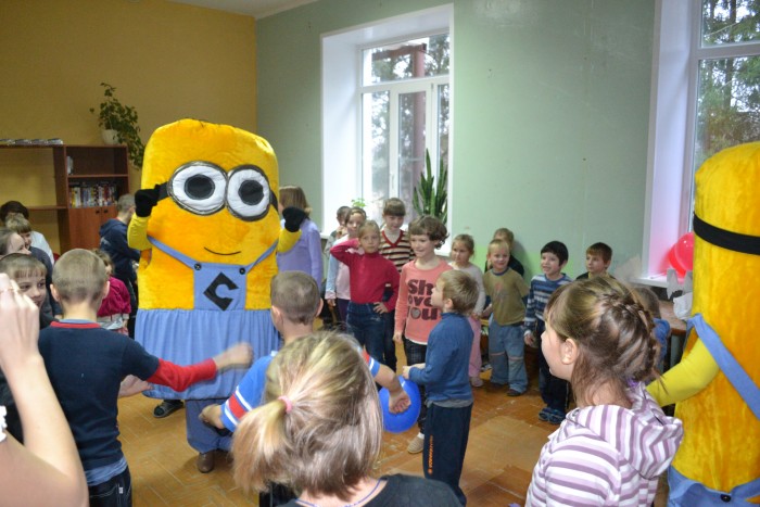 Во втором часе в зал неожиданно вбегают герои популярного мультика «Гадкий Я» - Миньоны! Дети в восторге! Все встают в круг и двигаются под зажигательную музыку. Конечно, у Миньонов тоже было немало сюрпризов для ребят (игры, танцы, конкурсы, сувениры, фотосессия с Миньонами). В конце второго часа каждый ребенок получил свой персональный подарок за яркое путешествие в страну чудес! Все остались очень довольны!