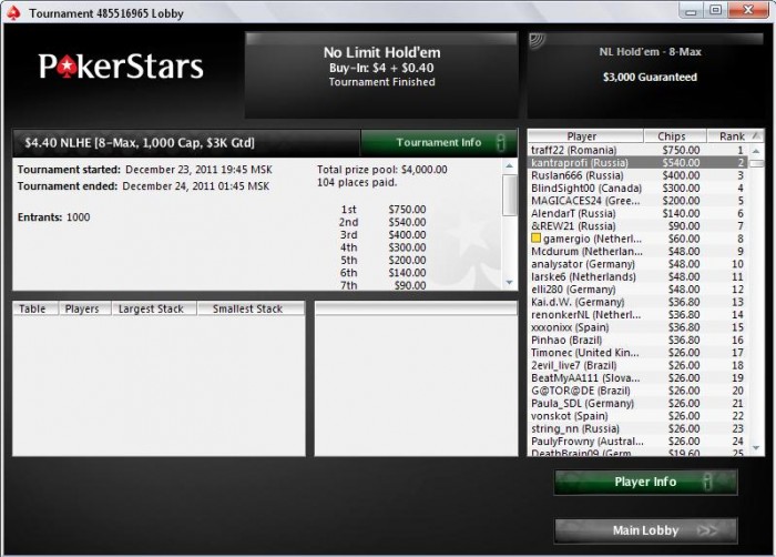 Poker Stars $5.00+$0.50 No Limit Hold'em Tournament - t30/t60 Blinds - 9 players -