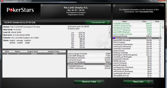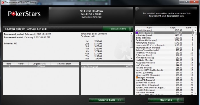 Poker Stars, $1 Buy-in (600/1,200 blinds, 125 ante) No Limit Hold'em Tournament, 9 Players