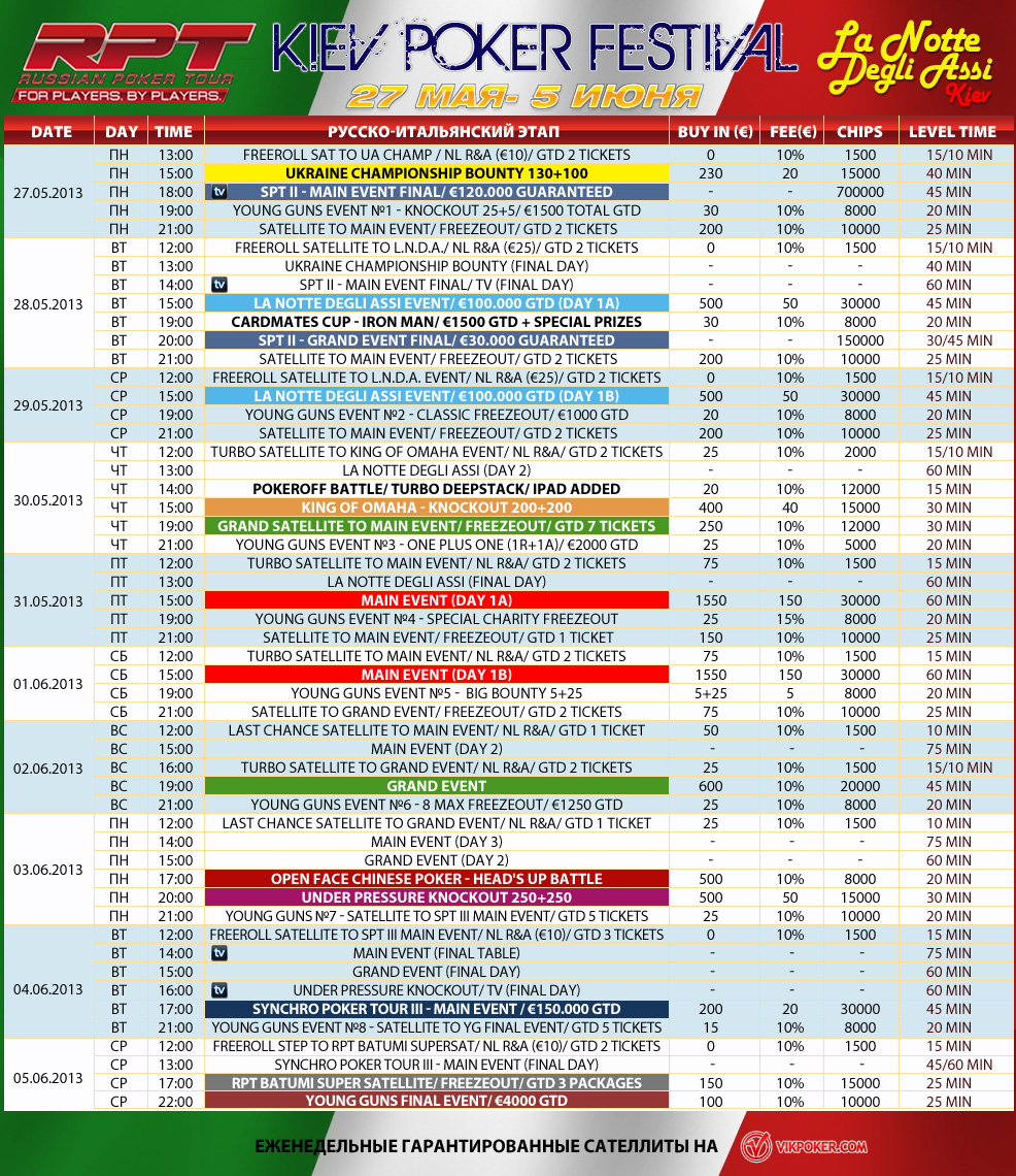 Напоминаем, что финал турнира пройдет 28 мая 2013 г. в Киеве в рамках RPT Kiev Poker Festival. Время старта: 20:00. Все финалисты получат 150.000 фишек в качестве стартового стека.