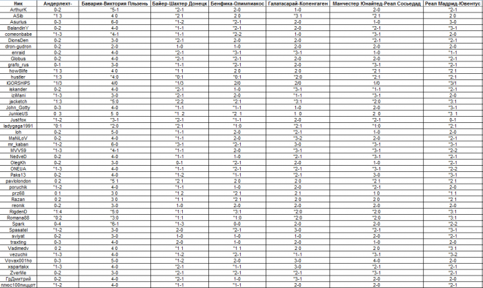 Не факт - слишком крупные победы Баварии и ПСЖ, мало кто ожидал победу Байера и ничью в португалии, так что тут набрать 10+ очков довольно сложно. Если только +100500 и еще 1-2 участника наберут.