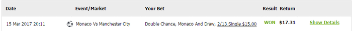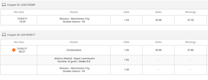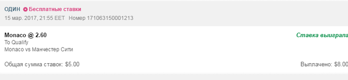 Ггшечка всем!! кто лепил на Монако, я для себя решил если будет гол в первые 10 мин лепить на проход, кэф конечно просел в половинку но нам и 2.6 хорошо, тем более был фрибэт на старзах, сам бог велел . Мой информатор брал проход Монако с 5 до матча. Ну и все говорили о ТМ на Атлетико - Баер я не стал исключением. Грацули всем фарту масти!!!!