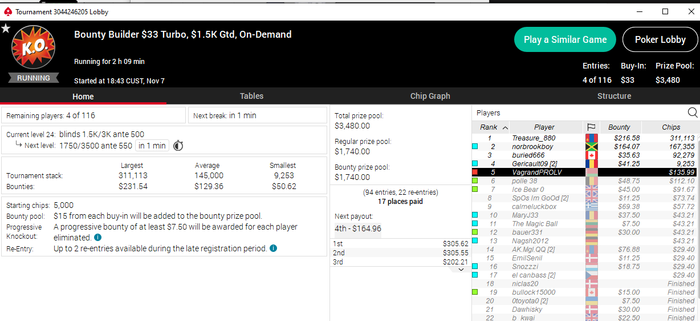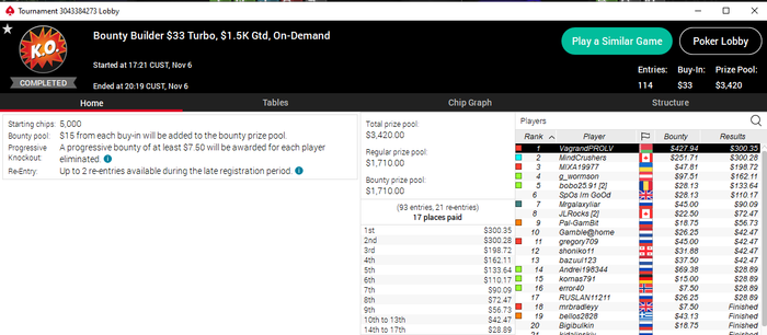 Сегодня норм покатал. На старзах правда минусанул, хотя если бы ключевую в билдере по 215 втащил то почти наверняка был бы нормальный плюс. На ПМ и Покерке выйграл по турниру+ снова неплохая попытка была в 210-ке, там вдобавок выбил брата стримера что дает проход в снгку с призовым фондом 5К и в которой играет человек 50 из которых часть это делает в ситауте)