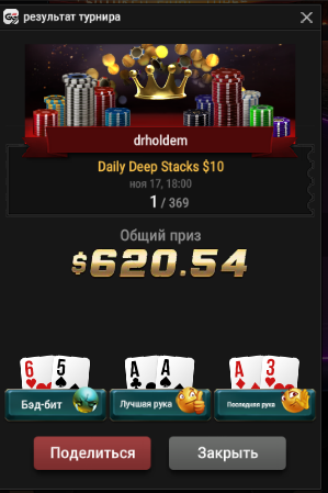 Всем привет) Сегодня со мной приключилась одна интересная и приятная история... Короче захожу такой на старзы, вижу выскакивает табличка, типо вам билет в турик по 5.5, я решил зайти в тикеты и посмотреть что к чему и оказалось что помимо этого билета по 5.5, там есть еще два билета по 55! Вот это поворот думаю я и регаюсь за них в два сателита к ЕПТ по 1050... И что бы вы думали? Выйгрываю один, а что со вторым я думаю понятно, его я тоже выйграл) Как итог завтра буду играть ЕПТ по 1050 с прекрасной структурой + получил 1050 турнирных сверху) Стримерам подкручивают?! Кстати, остался билет по 5.5, быть может с него получиться отобраться в мейн по 5К? А вы как думаете?) В любом случае продолжение это истории на моем канале завра в 21.05! https://www.twitch.tv/drholdem