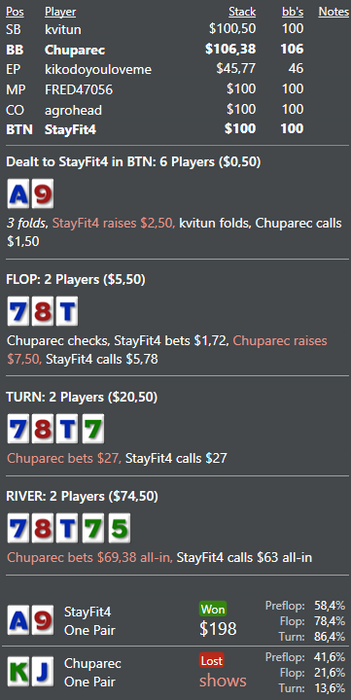 Pre-Flop: (1.5BB, 6 players) Hero is BTN 3 folds, Hero raises to 2.5BB, 1 fold, kukla1414 calls 1.5BB