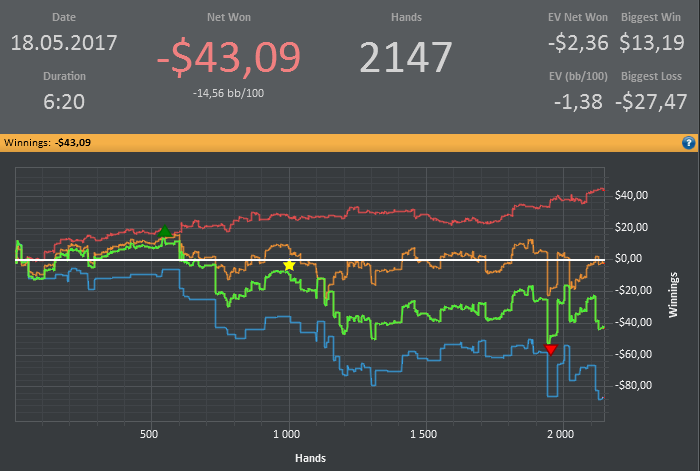 Размышляю: если мы готовы играть чек-пуш флоп, выбивая все блефы (т.е. готовы сыграть на стэк на флопе без А и К), то в этом случае мне больше нравится сыграть на стэк на терне. А или К появятся на терне не более в 15% случаев - думаю, можно рискнуть. С другой стороны, если опп не поймает А или К, то может и не продолжить ставить, а сыграет чек-пас. Получается, что мы тупо дали ему бесплатную карту. Значит, чтобы колоть флоп, мы должны быть уверены, что опп будет ставить в блеф терн. В принципе, я был уверен, что опп будет выставляться на терне, тк. у него в стэке осталось полбанка, но я ошибся.