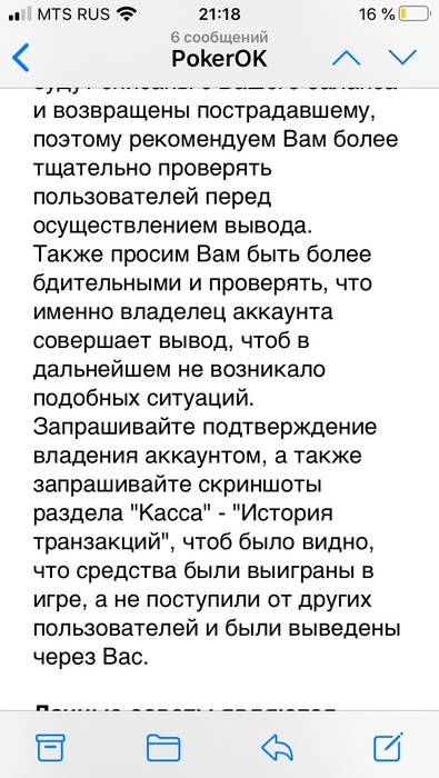 После этого я невероятно тщательно это делал и люди которые выводили потом вновь депозитили. Проверял так «Добрый день. Правила вывода: Вы отправляете мне скриншоты вкладок (аналогично прикрепленным: Историю транзакций, Профиль - мой аккаунт), где будут видны ваш номер телефона, почта, фамилия имя. Далее, подтверждаете, что номер телефона из скриншота совпадает с номером вашего сбп (номер на который привязана карта) или номером Qiwi, делаете перевод на мой аккаунт, я перевожу вам средства в течение 3-5 минут по курсу 75 рублей. Если номер от аккаунта покерка не совпадает, тогда должны совпадать имя фамилия в аккаунте с вашей почтой и именем фамилией получателя платежа.» И я уверен, что больше никакому мошеннику я не вывел. Но писало, конечно, очень много подозрительных людей, которым я всегда отказывал(они сами не отвечали мне после сообщения выше). И все таки меня получается заблокировали по опыту блокировки в декабре? К вопросу про разумный оборот. Средний оборот в день в январе был около $400-500 в день, в феврале, в начале марта $300-350. Также иногда один человек просил сделать депозит для другого аккаунта, но я всегда предупреждал что мультиаккаунтинг и игра в сговоре запрещены, на что мне отвечали, что это для друга, мы в сговоре не играем(просили обычно постоянные, другим отказывал) . Что еще… Да, вроде больше ничего подозрительного. За исключением того, что на вывод меня обманула девушка в декабре, потом она наглая писала мне еще раз в ту же группу, затем она же писала в другие группы, но по депозиту, очевидно я ей не ответил. А в конце, после какого депозита меня сразу заблокировали была тоже девушка и кстати после блока она мне больше не писала, словно знает что-то. Допустим при выводе я понимаю, что люди как то взламывают аккаунты и выводят. Можно ли обмануть при депозите?