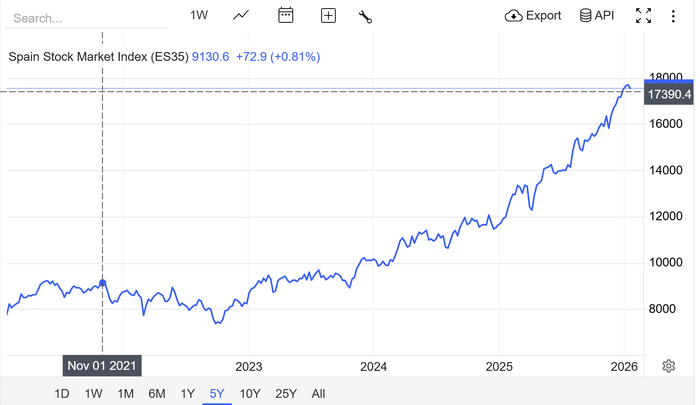 Я уже жил год в Барселоне, испанский опыт мне понравился. Есть вопросы к кухне, все-таки не Франция и не Италия, но близость моря\океана спасает. Переехать в Испанию сейчас полегче, чем в Италию. График испанского индекса за пять лет выглядит более впечатляюще, чем S&P500.