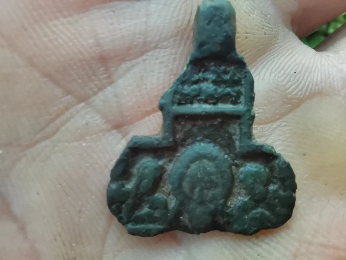 На выходе из леса-вдруг чёткий сигнал-52!Эх был бы крестик целый-какой то необычный-лепестки такие короткие! Явственно виден Спаситель в центре-бо бокам наверно святые! В лупу лучше видно чем на макро!