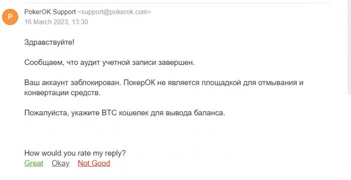 Если баланс не пополнился в течение 30 минут, напишите в саппорт и предоставьте чек (где будет видна сумма, время и получатель). Cвязаться со службой поддержки ПокерОК можно: