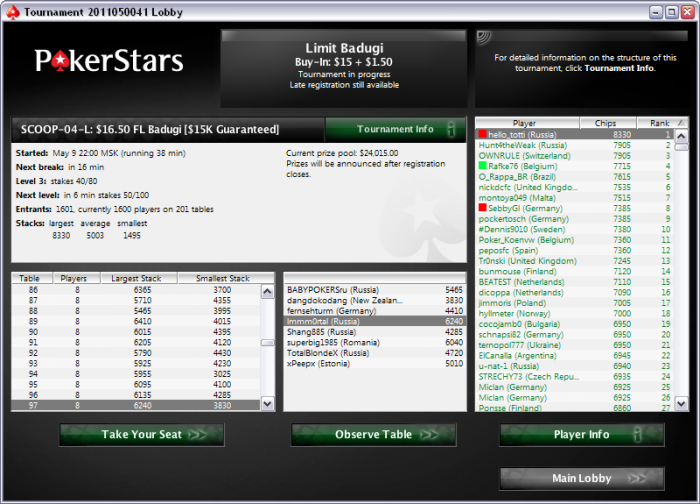 exlead @ 7.5.2011 хорошие новости) 3.3 турбо ребай, 7.7 убрали . за место них поставили 3.38р нетурбо (через 3 часа максимальные блаинды), все бы ничего только 9 столов за 3.5 часа , за место 7.7 5.43 тож тосковый набор... надеюсь американцы в этом году вернутся)