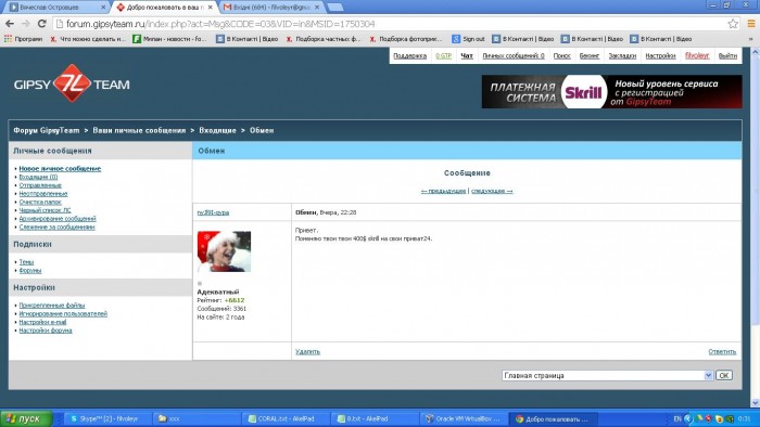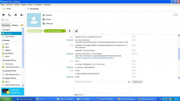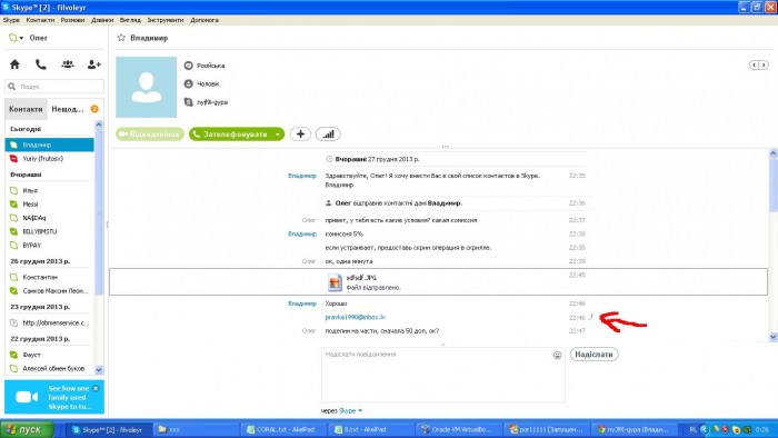 я ему написал свой скайп, дале переписка скайпа. Заметьте что сначала указал емайл pravka1990@yandex.ru а потом уже после того как я перевел деньги изменил на pravka1990@inbox.lv , на скрине отметил позначку редактирования. сделал он это на случай отмазки мол а мне ведь деньги не поступали...
