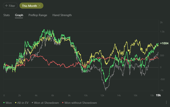 Так как я хобби-игрок, то хвастаться результатами не получится - у меня слишком много фан-коллов, фан-блефов и фан-сессий, которые нейтрализуют стратегические разработки, и каждый месяц похож на прошлый, как и этот: