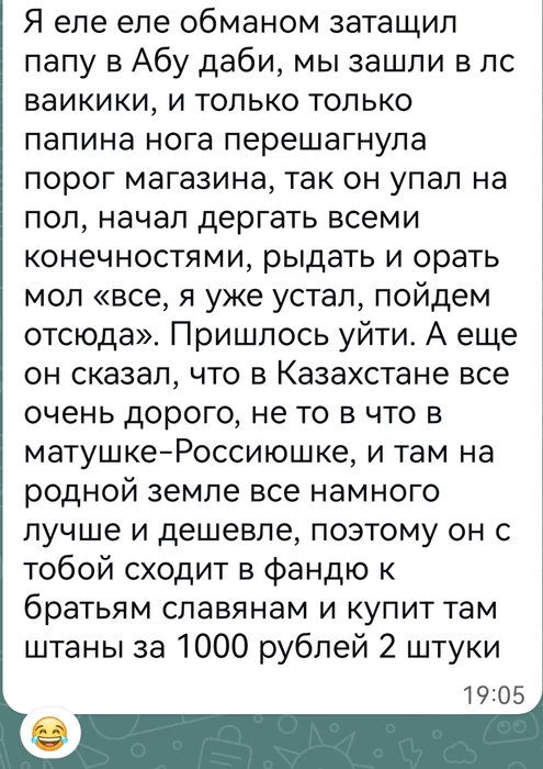 Но на сей раз зашли внутрь 😳 Дело в том, что жена настаивала на том, чтобы я купил себе штаны и непременно в Казахстане 😯 Я отбивался как мог, но в итоге получилось примерно так, как описал сын, отчитываясь о содеянном перед своей мамой в чате 3,14я: