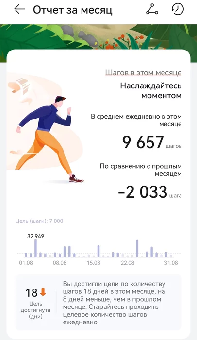 Ходьба. Казалось бы, месяц, в котором дважды преодолевал планку в 30к шагов за день, несколько раз выхаживал +/-20к шагов должен был быть мегакрутым, но было очень много дней по 2-3к шагов, поэтому в общей сложности не добрёл ~700 шагов до 300 000, а до золота ~ 50 700 соответственно. Старт был неплохим, но потом 12 августа заболел, и всё... Но об этом подробнее чуть позже.