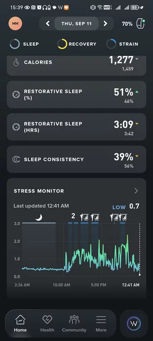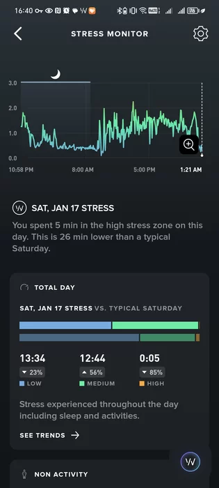 Отвечая про 1 зону, думаю пульс там был очень близко к 0%. А может реально 0. Я прост даже не помню что бы он выше 90 прыгал во время катки. По стрессу этот же день: