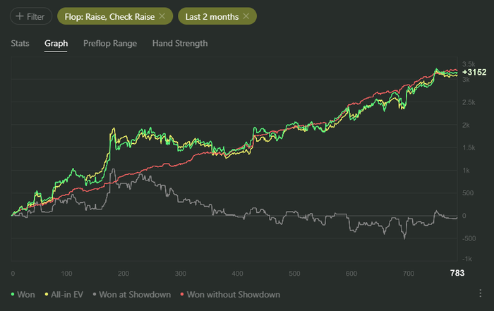 Затайчусь, конечно же, и перестану так же чек-рейзить людей, которые начнут меня 3-бетить (пока никто не начал) или просто хотя бы заметят мое поведение. Да и чек-рейз у меня не 100%, конечно (а 22% за эти 2 месяца). Все-таки в подстройке надо еще и учитывать, насколько просто будет перестроиться другой стороне.