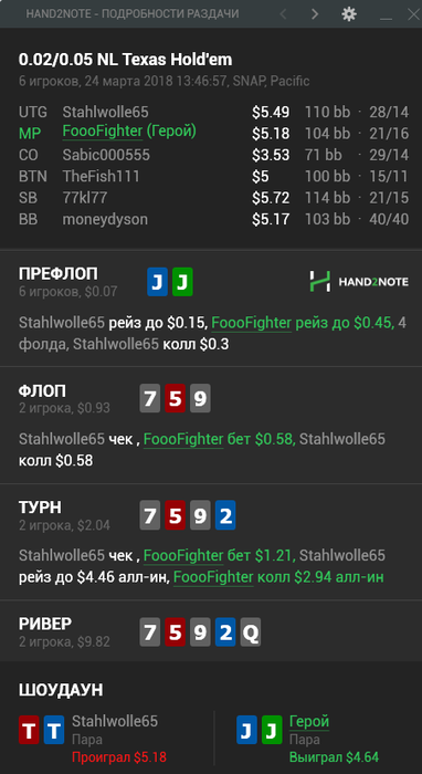 Чем смогу, но на идеальность не претендую. В твоей раздаче я бы смотрел чисто на статы (800 рук не так уж и мало): 1. Это агрессия 2. Выигрыш на ШД Если опп пассивный, а выигрыш на вскрышке высокий - это всегда пас с руками ТТ-QQ. Мне не нравится его чек на терне (равно как и трибет с ТТ на префлопе), но это уже дело вкуса и стиля игры.