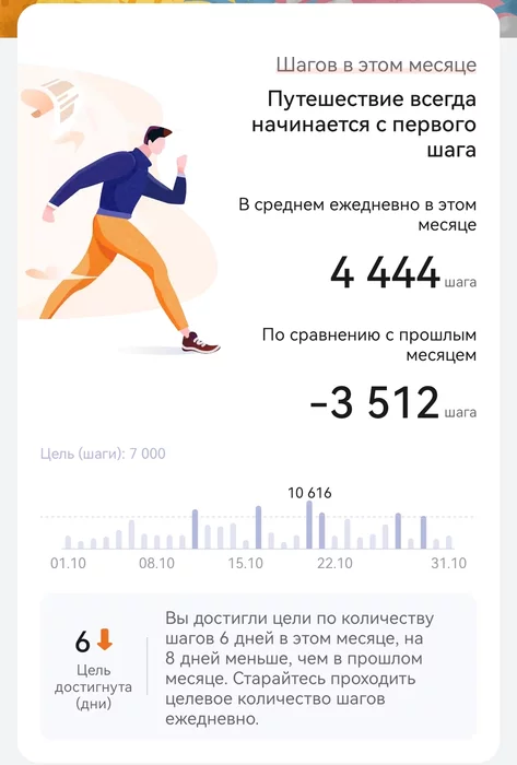 Ходьба. В октябре лето резко сменилось зимой, и мне также резко расхотелось гулять. Вышли пару раз в начале месяца на нанопрогулку, а там гололёд, идти вообще невозможно, так настроение и пропало. В итоге без шансов для медалей. Дома тоже не ходил, плюс колено опять ныть начало. В общем все факторы сложились в такой неутешительный итог.