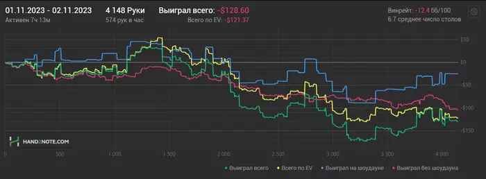 08/11/2023: 3.30ч, 1163 рук nl25 +$105.