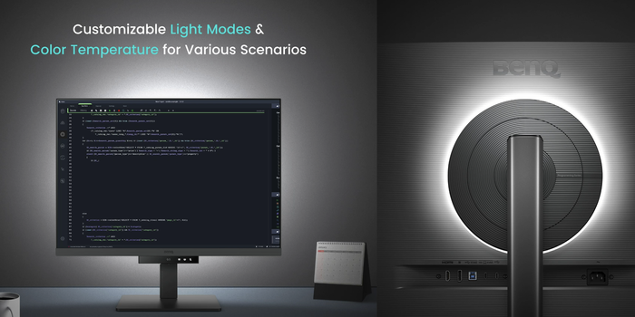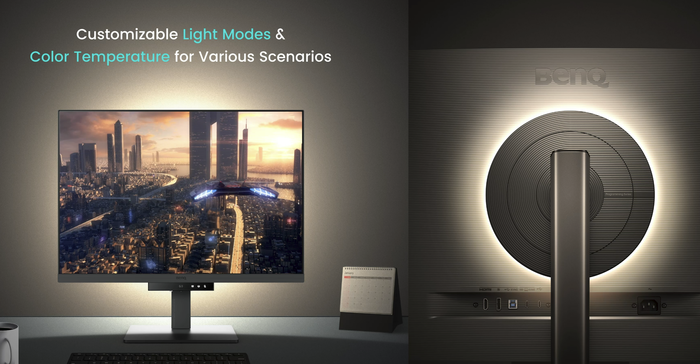 Из неожиданного - в него еще встроена лампа сзади, которая освещает стену за монитором, чтобы в вечернее время контраст между экраном и окружающей средой не напрягал и глаза уставали меньше. Я сначала воспринял это как ненужную нагрузку, но в итоге довольно полезно на самом деле. Яркость и температура света управляются: