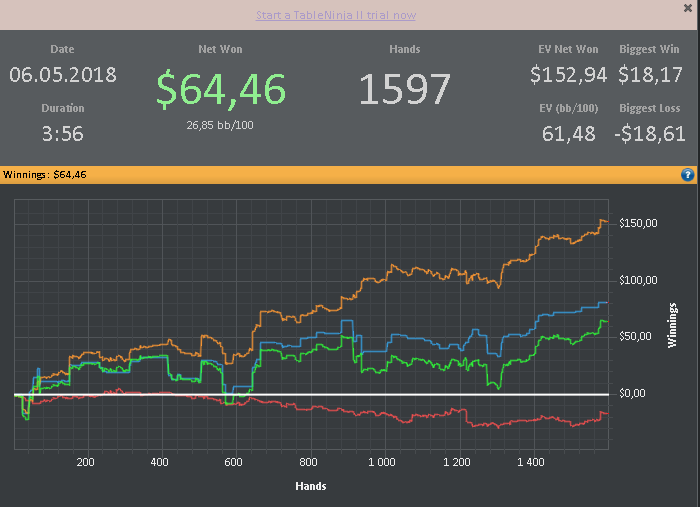 Понимание никуда не делось, оно есть. Но есть ещё и удача, которая "не должна играть роль на дистанции", но у меня почему-то играет и очень сильно. Просматривал крупные проигранные раздачи: "монетка", "куллер", "перееезд", "нет паса против этого оппа", "гатшот оппу закрылся на ривере после рейза терна", "плохо сыграл", и снова по кругу. Конечно, было много ошибок, но их незначительная часть.